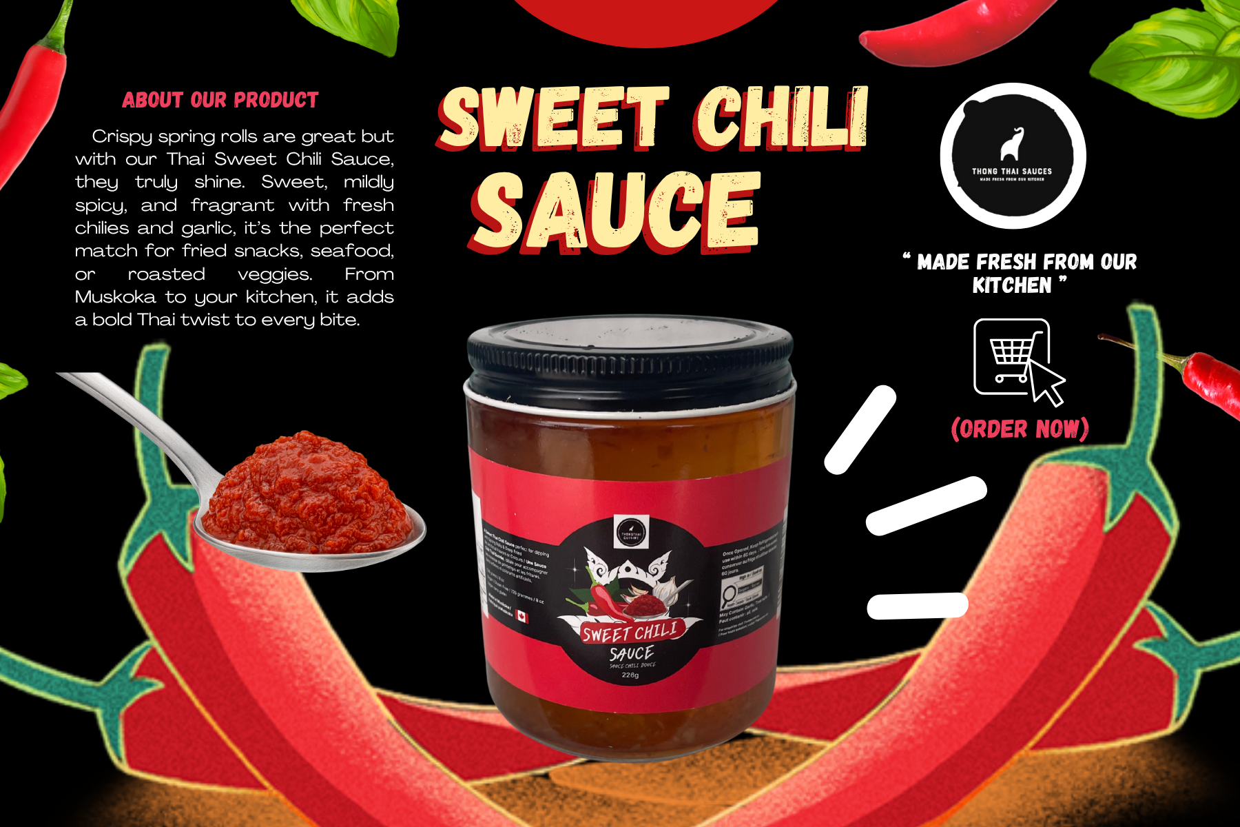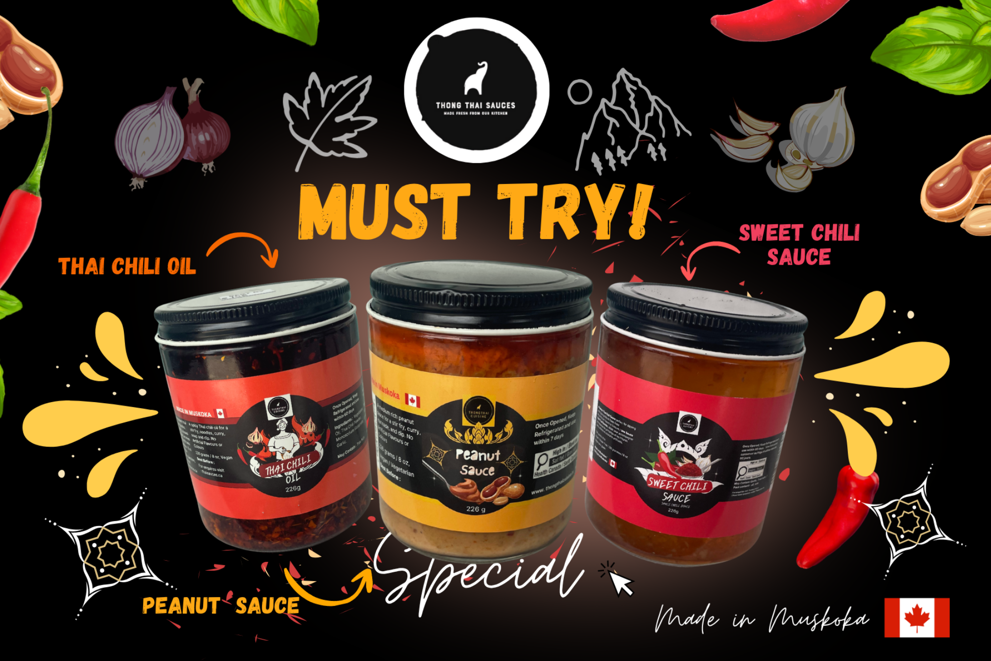 Founded in 2021, our journey began with the opening of my Thai restaurant in the heart of Muskoka. From the very beginning, we focused on creating authentic, homemade dipping sauces - including our signature peanut sauce and Thai spicy chili oil - to perfectly compliment our dishes. Our customers quickly fell in love with the unique flavours and began asking if they could purchase the sauces on their own. Inspired by their enthusiasm and support, we decided to make our popular peanut sauce available to the public. Today, our sauces are crafted with the same care, quality ingredients, and traditional Thai flavours that made them a favourite in our restaurant.